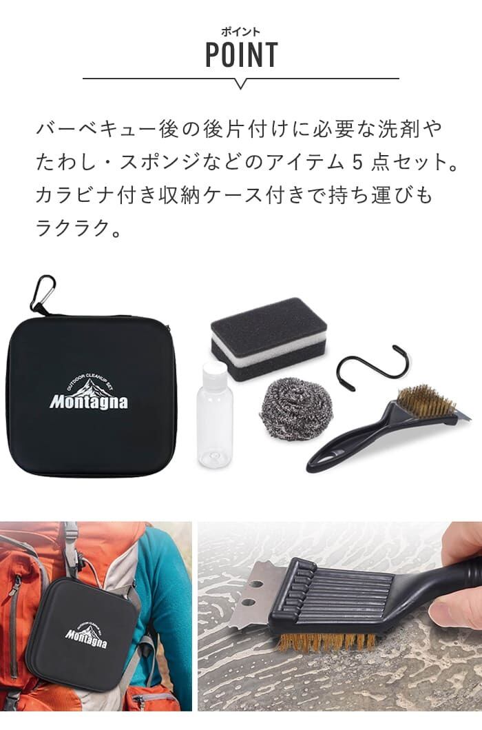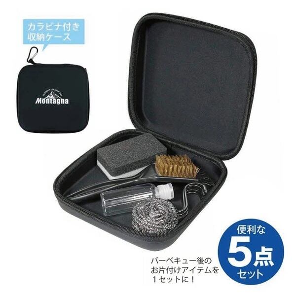 バーベキュー後の後片付けに必要な洗剤やたわし、スポンジなどが入った便利な5点セット。